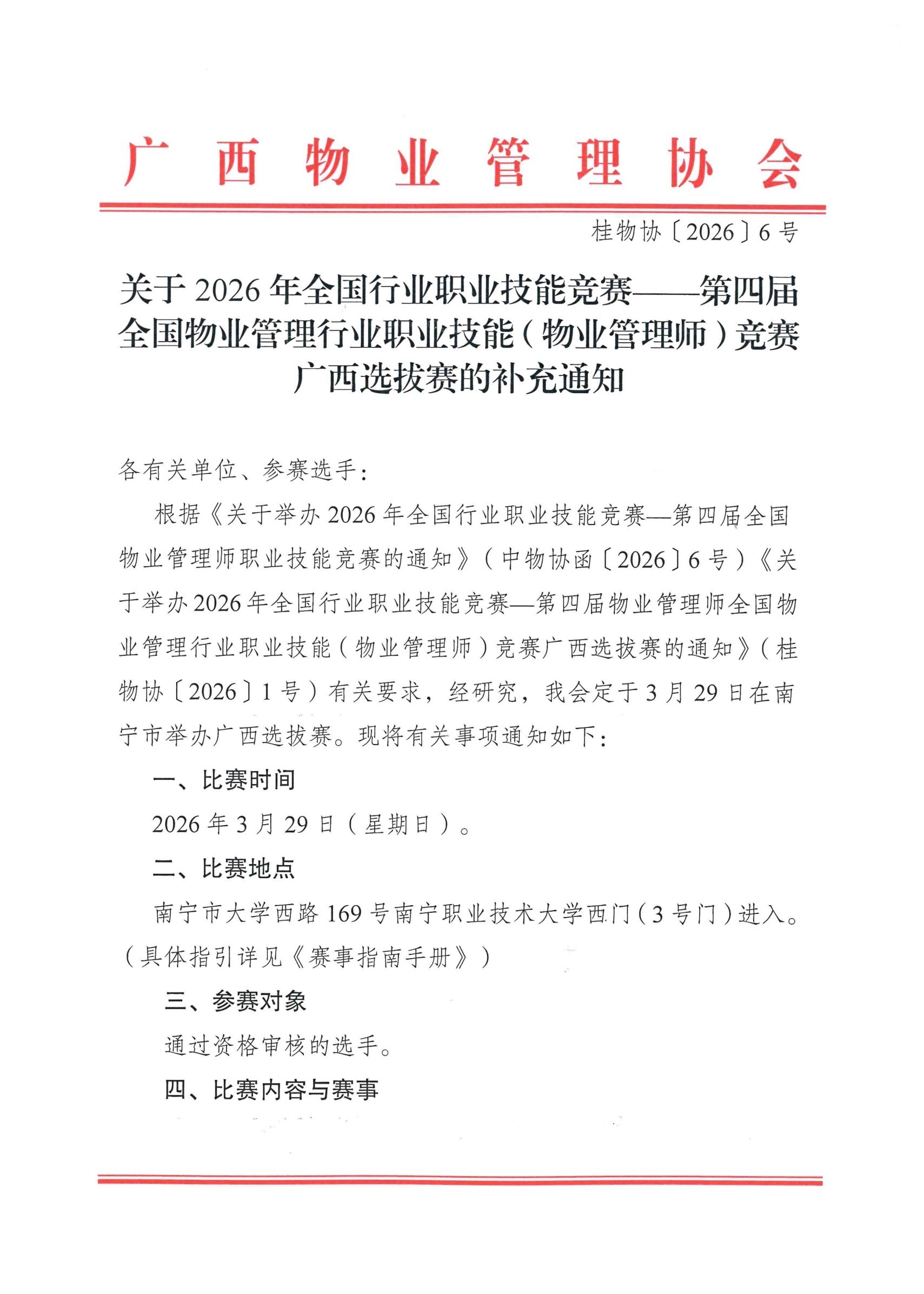 关于2026年全国行业职业技能竞赛——第四届全国物业管理行业职业技能(物业管理师)竞赛广西选拔赛的补充通知